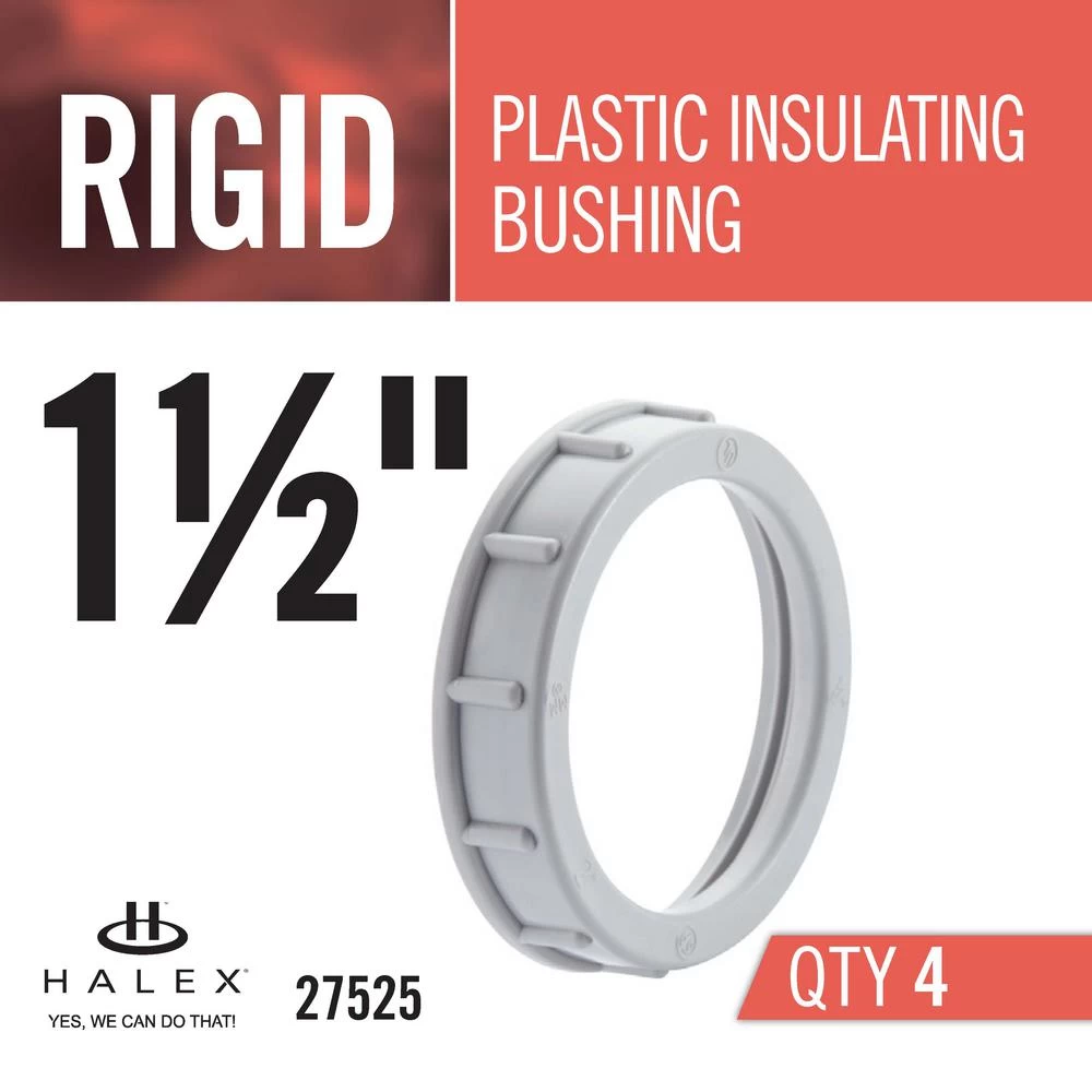 The 1-1/2 in. Plastic Insulating Bushings (4-Pack) are for use on threaded IMC or rigid conduit to protect the wires. The bushings are made of high-impact, fire-retardant thermoplastic. These bushings meet UL and CSA requirements.