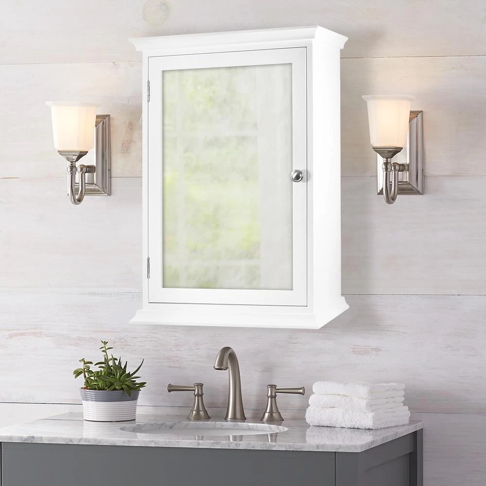 Enjoy safe, affordable fog-free technology with the 19-7/8 in. W x 28-1/4 in. H Fog Free Framed Recessed Mount Extended Storage Bathroom Medicine Cabinet in White. No more wiping off your mirror or using a hairdryer to get a fogless reflection. Featuring extended storage space and decorative crown molding, this cabinet offers spa quality and style. Constructed with a Wood Composite frame for exceptional strength and durability. The 3 adjustable shelves offer flexibility in storing your toiletries. Can be mounted to open left or right. Fully assembled for your convenience.