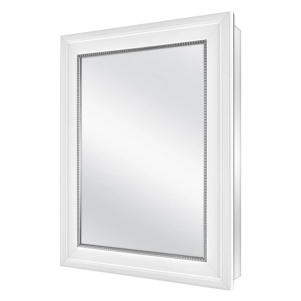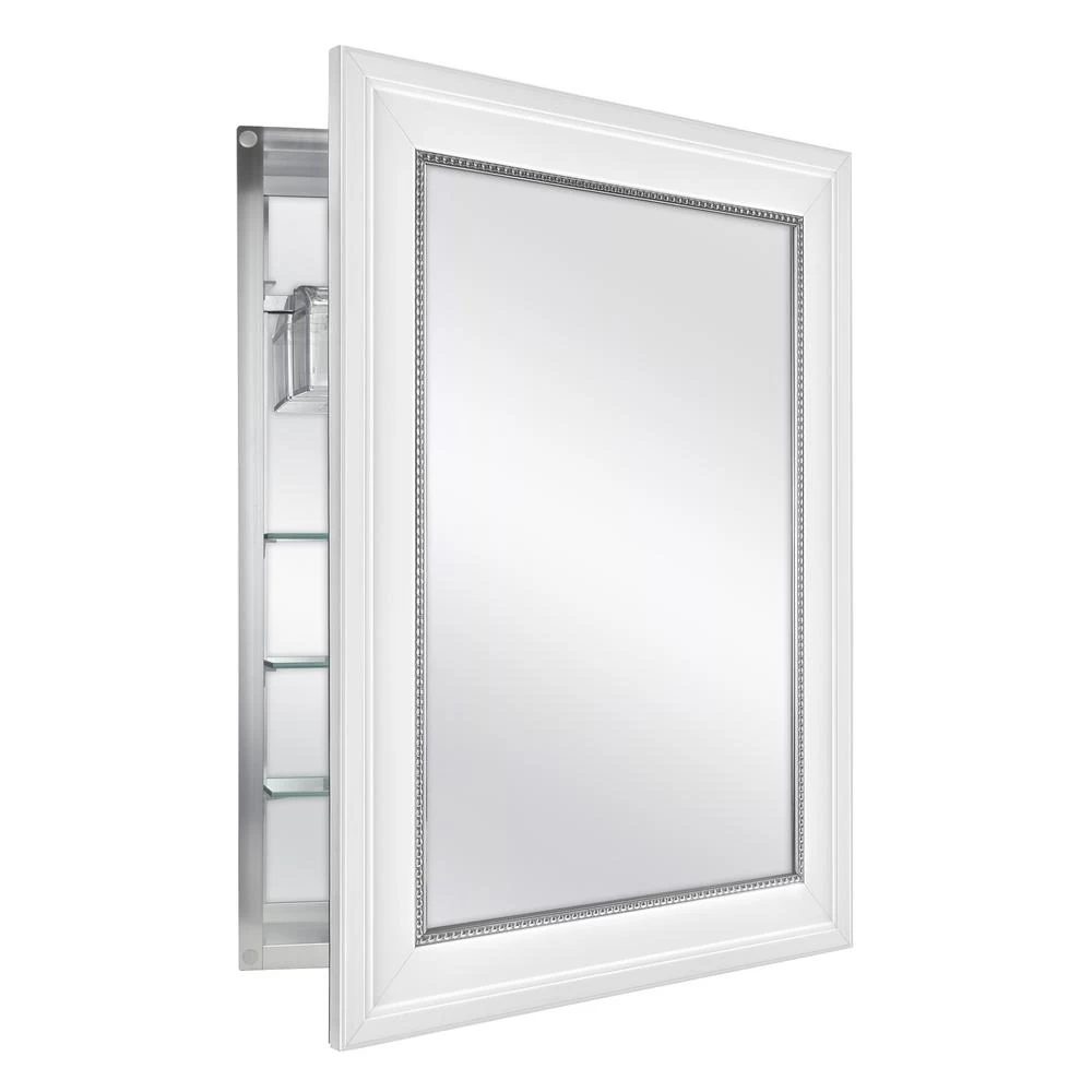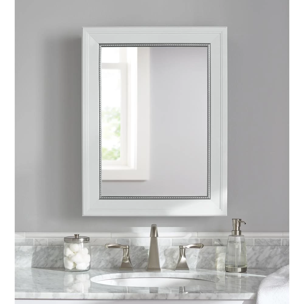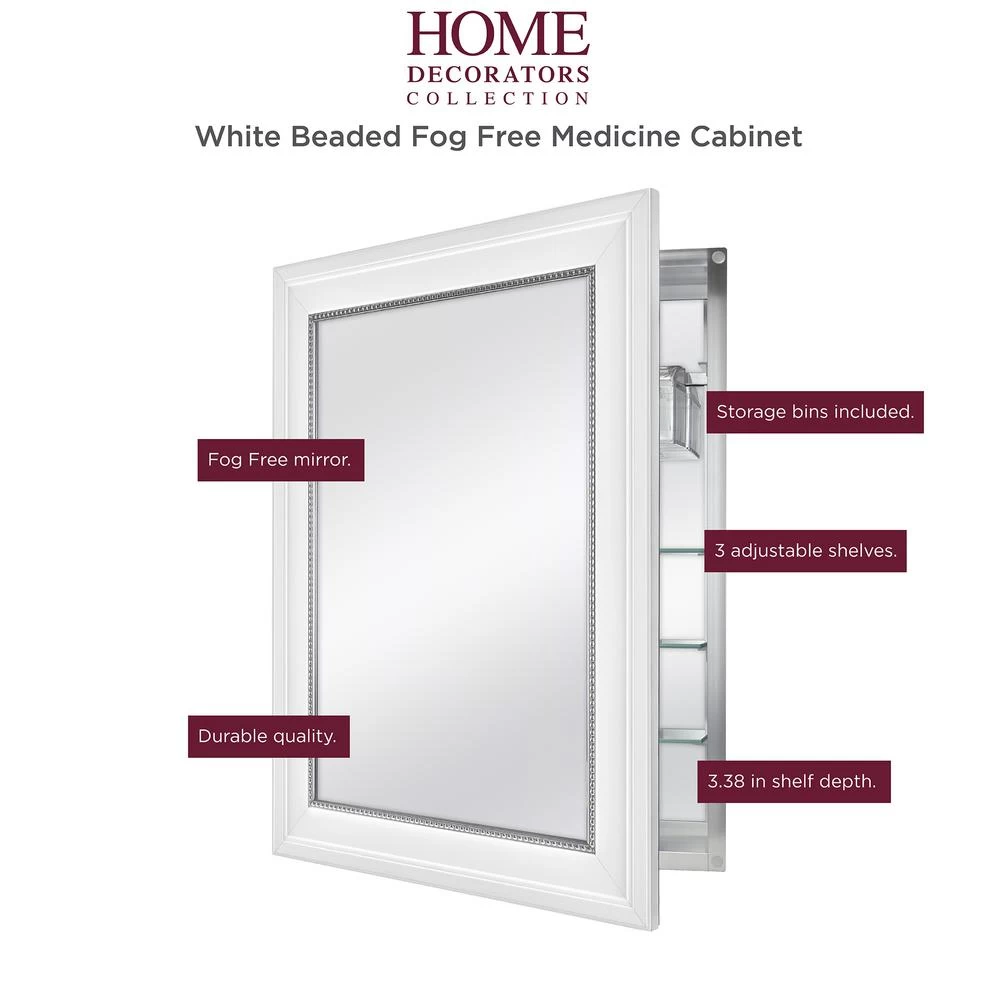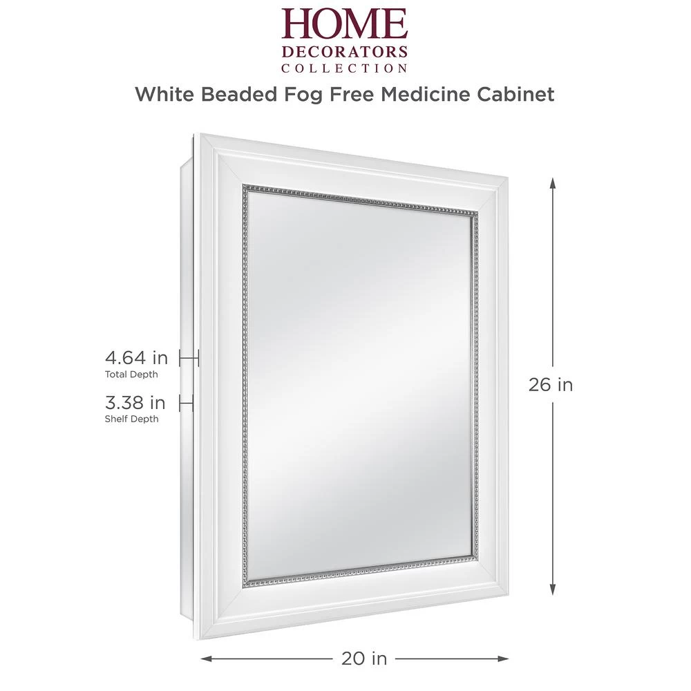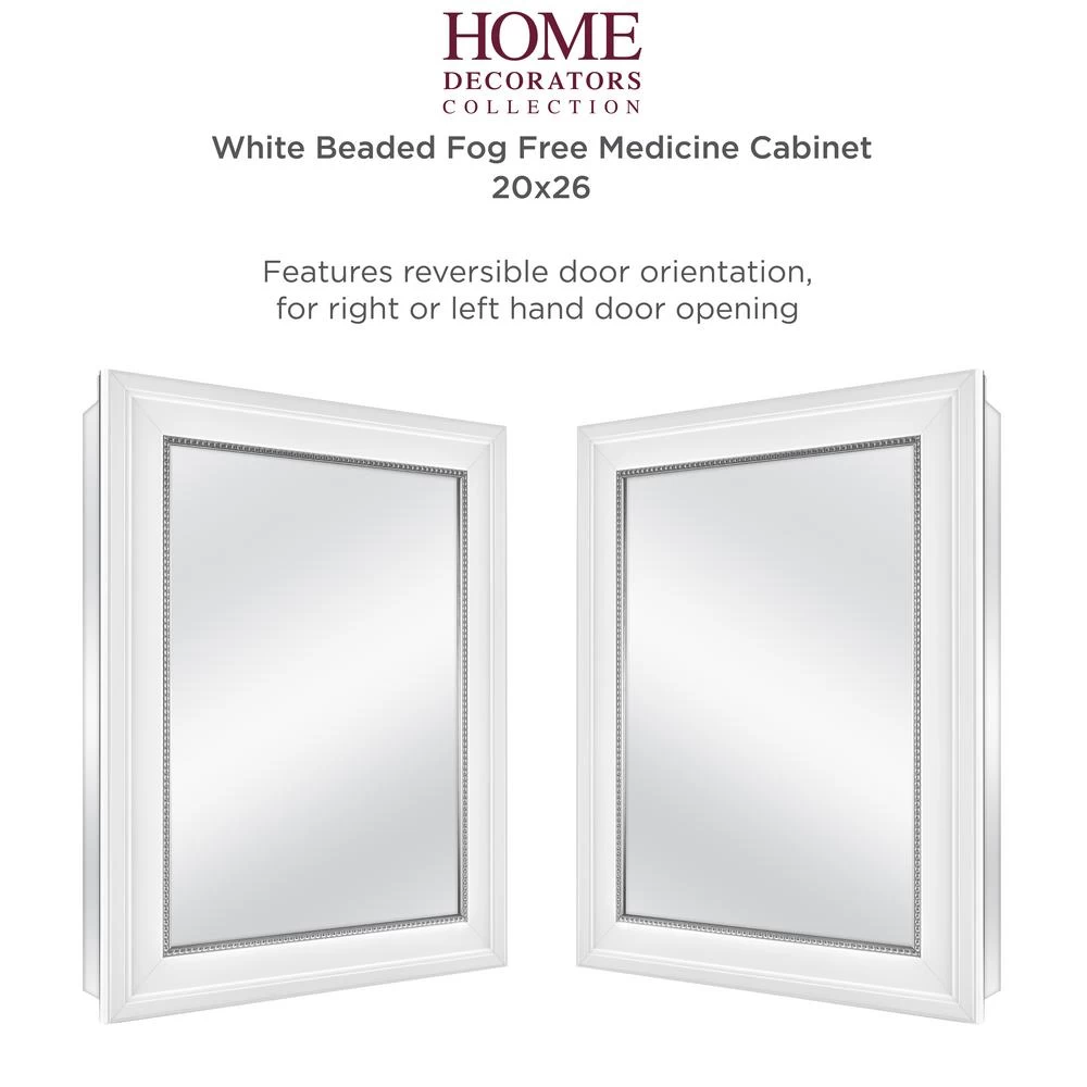 The Home Decorators Collection 20 in. W x 26 in. H x 4.64 in. D Fog Free Framed White Beaded Medicine Cabinet gives you a fogless reflection you’ve always dreams of. Our innovative, fog-free technology is safe, affordable and does not require heating elements. You can finally enjoy a fog-free view after a steamy shower. This medicine cabinet can be recessed or surface mounted. Includes side mirrors and hardware for optional surface mount feature. Use the two double shelf pegs for quick and easy customized storage space along with the 3 adjustable glass shelves. Also included are 3 removable bins for even more storage that are dishwasher safe. The door opens 165° allow for optimal usage of the interior door and back mirror for multiple viewing angles for added functionality. The durable rust-free aluminum frame is exceptionally strong and the mirror is already assembled for your convenience. The EZ-cam hanging system allows you to securely install your medicine cabinet with the included hardware and hanging instructions. The versatility of this cabinet also allows the door to be reversible to open left or right based on your preference. The white beaded finish can easily coordinate with any existing bathroom hardware.
