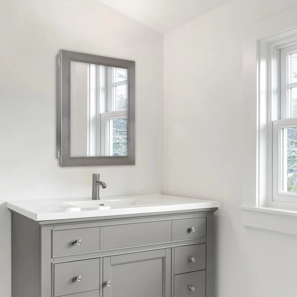 A perfect complement to any bathroom style, the Glacier Bay 20 in. W x 26 in. W x 4.64 in. D Beveled Frameless Medicine Cabinet features a stylist pewter finish. The polystyrene cabinet and frame is lightweight, durable and resistant against mold and mildew. This medicine cabinet can be recessed or surface mounted. Includes double shelf pegs and 2 adjustable shelves that allow for quick and easy customized storage space. The versatility of this cabinet also allows the door to be reversible to open left or right based on your preference and door opens to 140°. The pewter finish can easily coordinate with any existing bathroom hardware.
