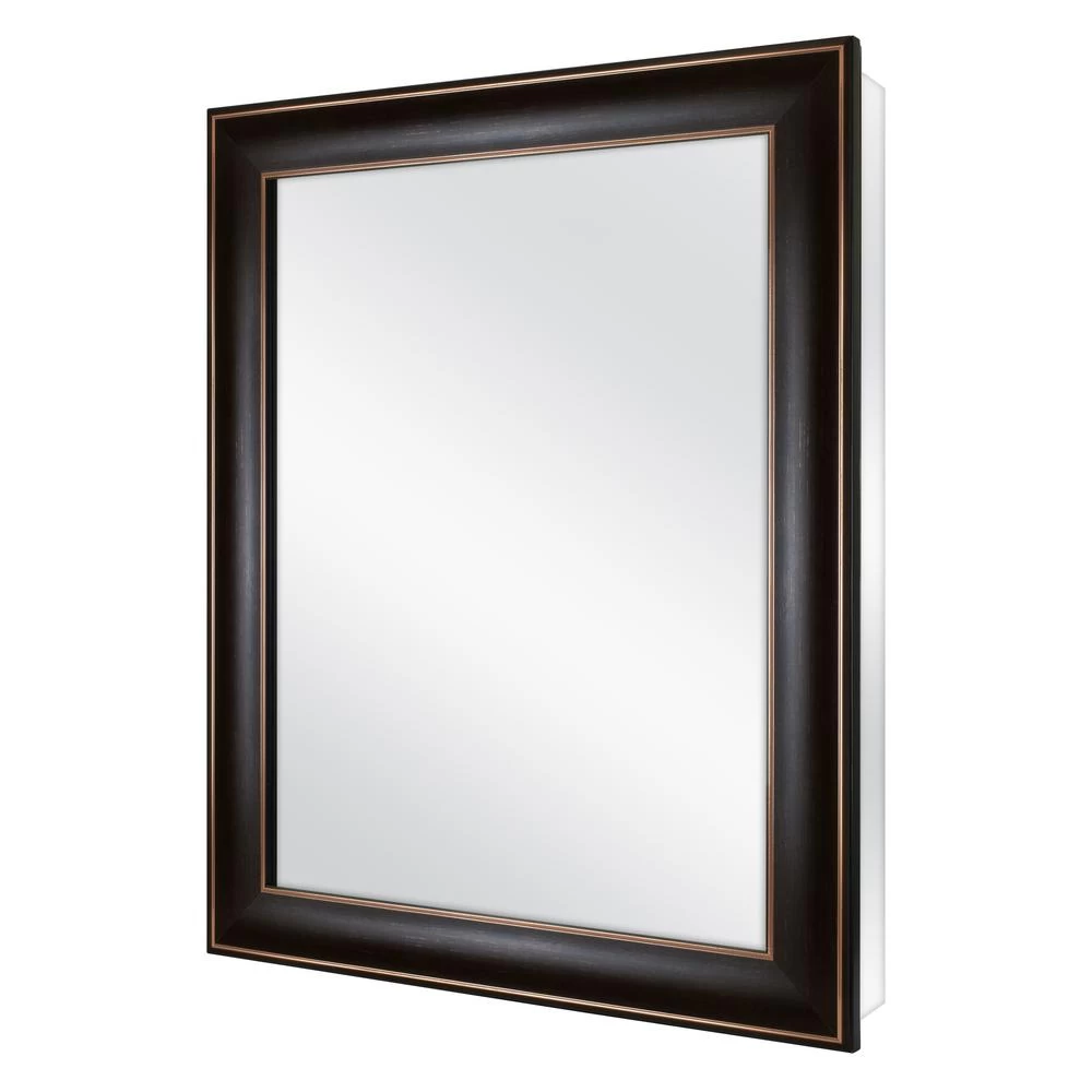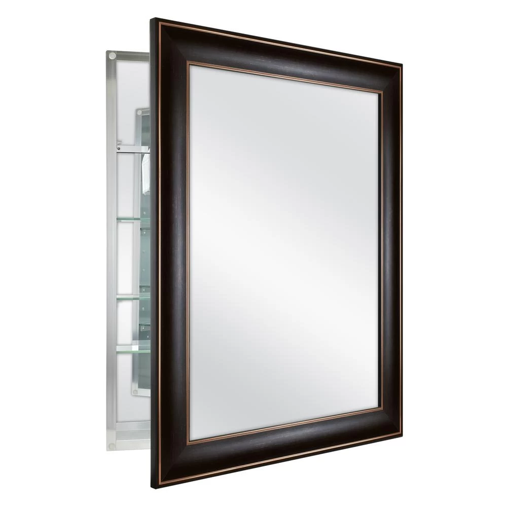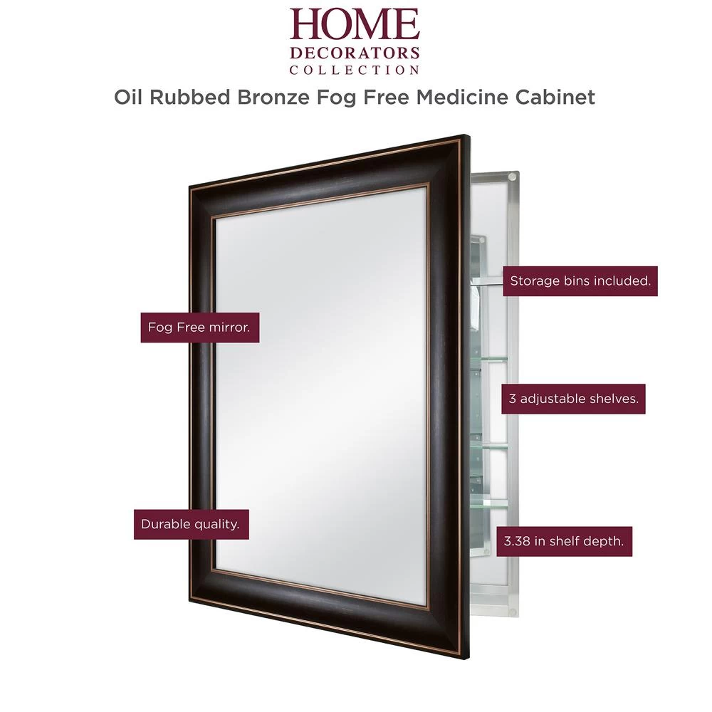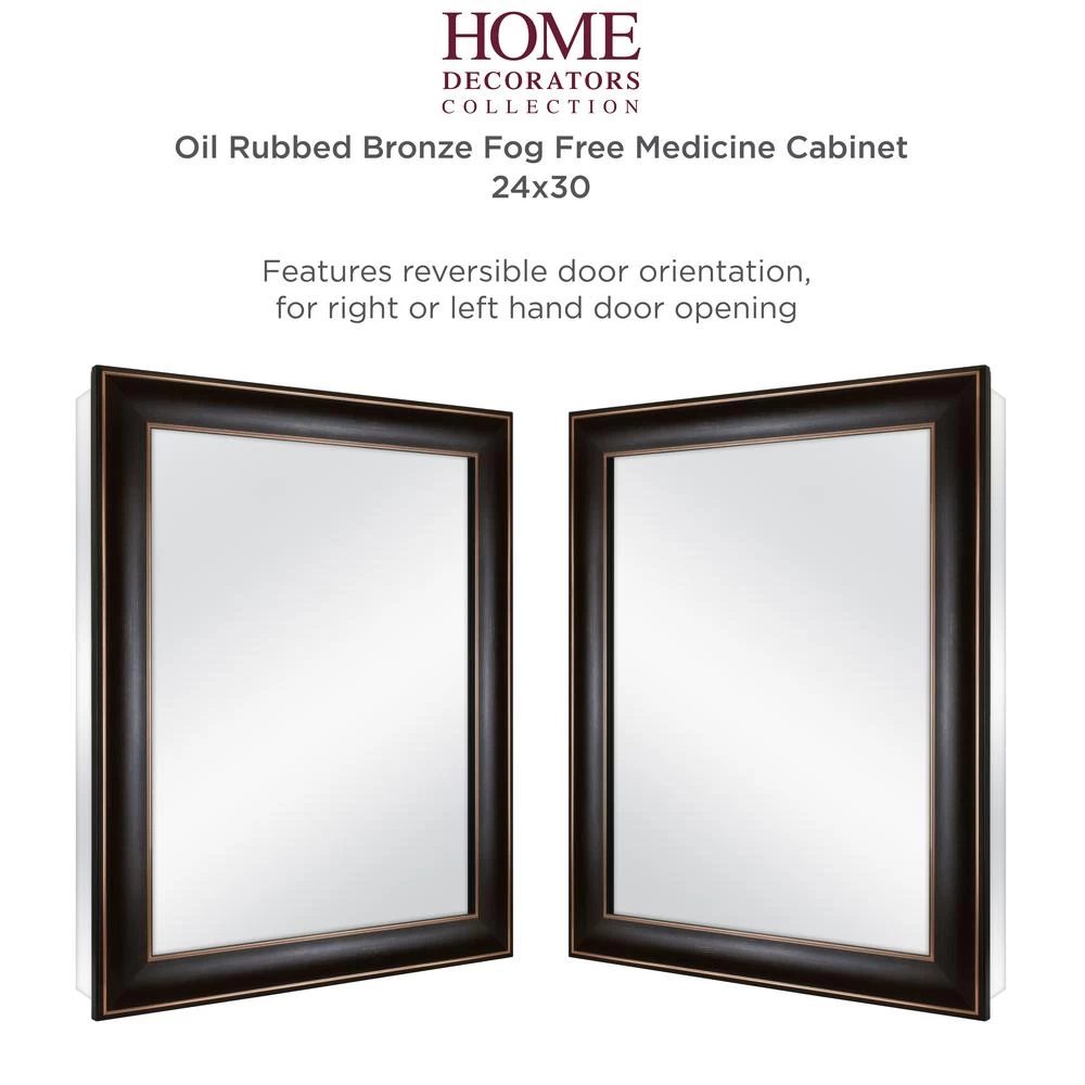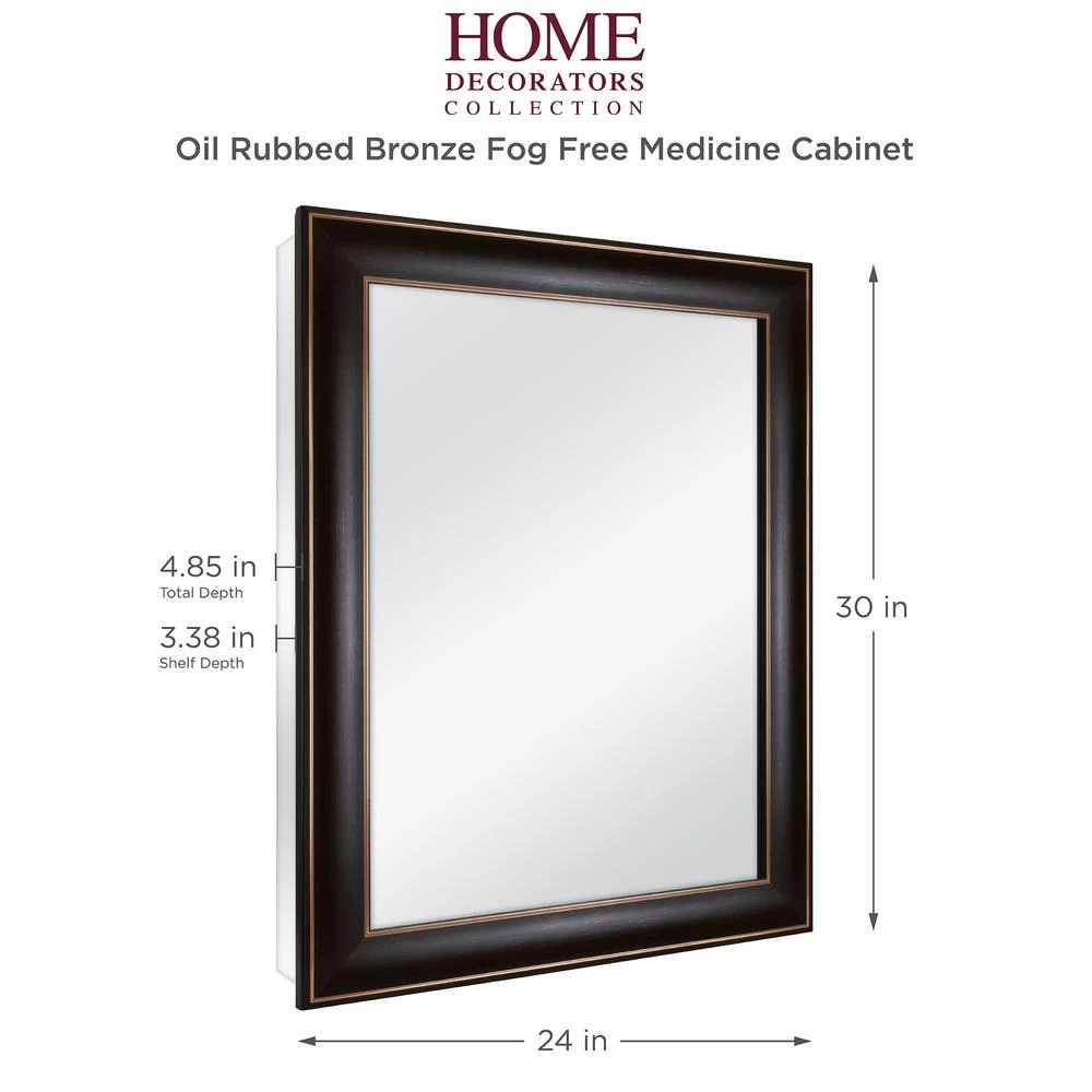 The Home Decorators Collection 24 in. W x 30 in. H x 4.85 in. D Fog Free Framed Oil Rubbed Bronze Medicine Cabinet gives you a fogless reflection you’ve always dreams of. Our innovative, fog-free technology is safe, affordable and does not require heating elements. You can finally enjoy a fog-free view after a steamy shower. This medicine cabinet can be recessed or surface mounted. Includes side mirrors and hardware for optional surface mount feature. Use the two double shelf pegs for quick and easy customized storage space along with the 3 adjustable glass shelves. Also included are 3 removable bins for even more storage that are dishwasher safe. The door opens 165° allow for optimal usage of the interior door and back mirror for multiple viewing angles for added functionality. The durable rust-free aluminum frame is exceptionally strong and the mirror is already assembled for your convenience. The EZ-cam hanging system allows you to securely install your medicine cabinet with the included hardware and hanging instructions. The versatility of this cabinet also allows the door to be reversible to open left or right based on your preference. The oil rubbed bronze finish can easily coordinate with any existing bathroom hardware.