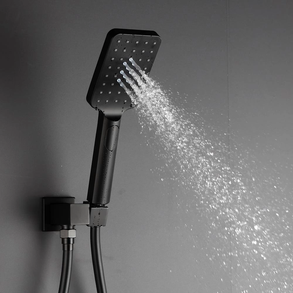 - What You Get — All parts of the rain shower set are made of high-quality materials with professional technology. Those parts include 10-inch square rainfall shower head, handheld shower head, 15-inch shower arm, shower holder, pre-embedded valve, and 60-inch shower hose. The matte black finish and brass combination offers anti- corrosion and classical looking.