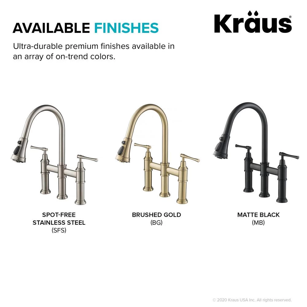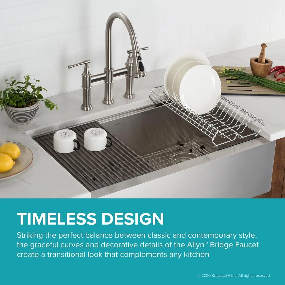 Striking the perfect balance between classic and contemporary style, the graceful curves and decorative details of the Allyn Bridge Faucet create a transitional look that complements any kitchen. Designed for ultimate convenience, the 3-function pull-down spray head provides maximum flexibility for all your kitchen tasks and allows you to hit every hard-to-reach corner of your kitchen sink. Switch from aerated stream or spray for everyday tasks to a powerful blade of water that sweeps away food residue at the push of a button. The elegant gooseneck spout easily accommodates your largest cookware, and adds to the soft transitional aesthetic. Solid brass construction and best-in-industry components ensure long-lasting leak-free performance. Customize the Allyn faucet with your choice of finish, including Brushed Gold, Matte Black, and Spot Free all-Brite Stainless Steel which prevents fingerprints and requires less cleaning.