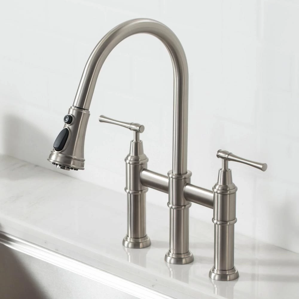 - Bridge faucet design: a horizontal bar connects hot and cold water handles to the faucet spout for a bold classically-inspired look