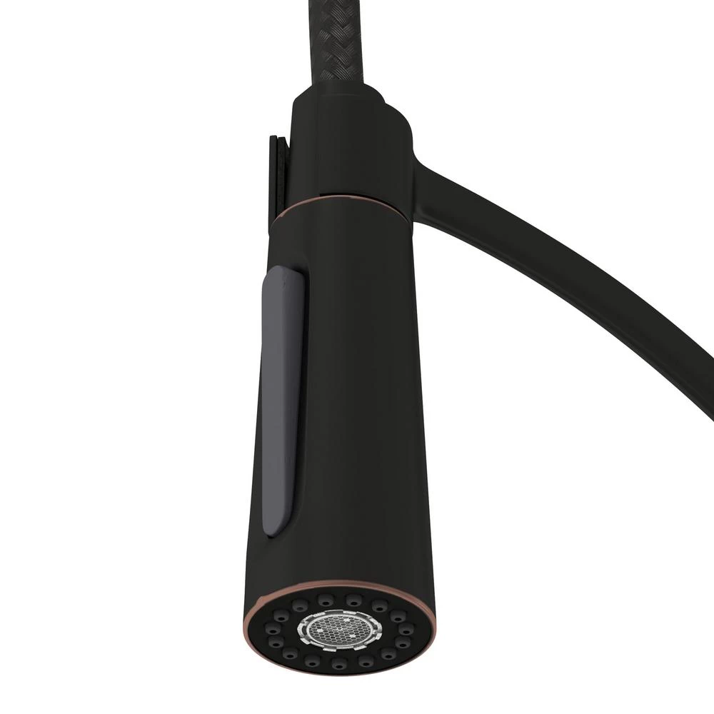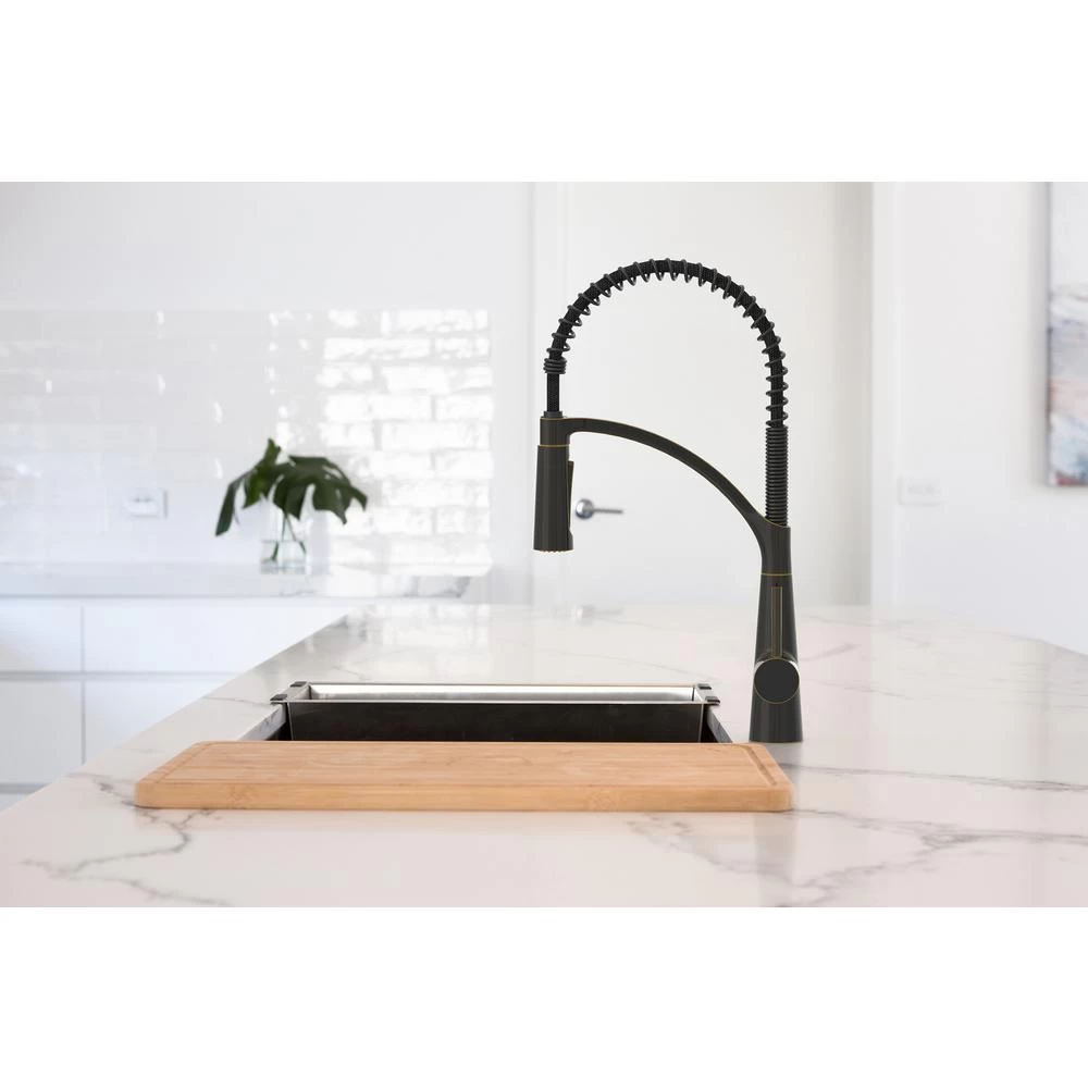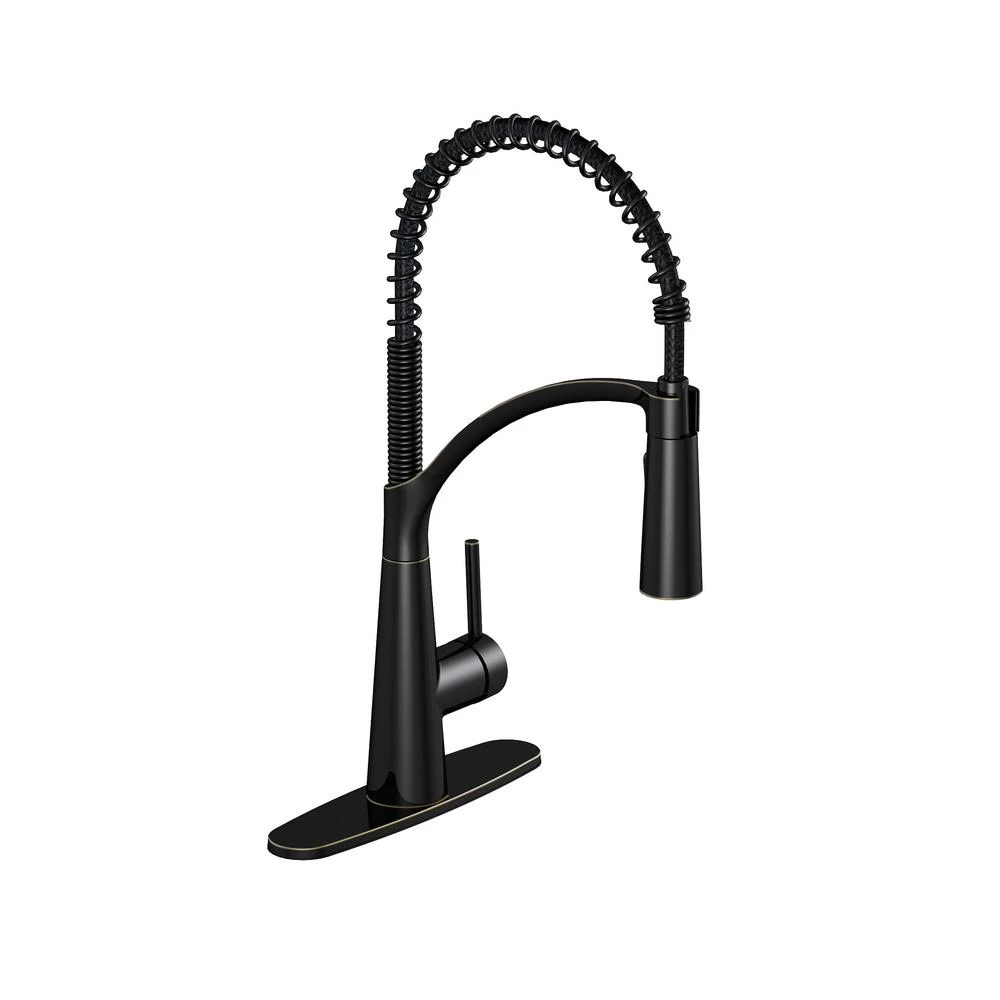 Enhance your kitchen with the professional style of this single-handle, pull-down kitchen faucet. Designed with a modern, oil-rubbed bronze finish, it features a spring-neck design for flexibility. The dual-function spray and stream offers additional versatility. Boasting a water-saving 1.8 GPM flow rate, this durable kitchen faucet includes quick connections and supply lines for easy installation on one- or three-hole sinks. It also comes with a drip-free cartridge and easy-clean removable coil.
