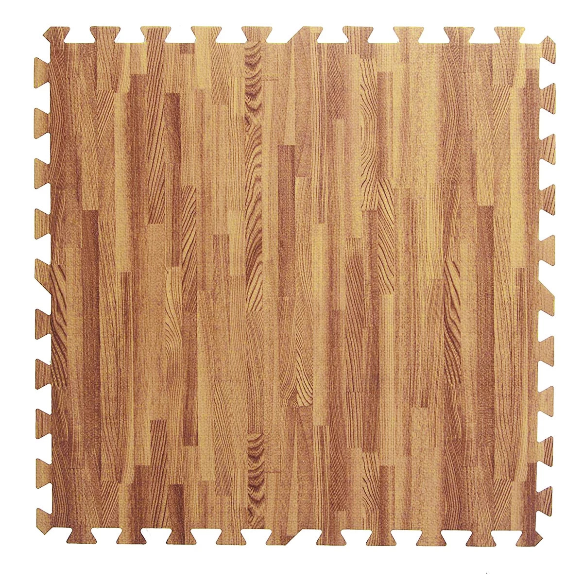 - VERSATILE ? The water-resistant and noise-resistant foam mat is easy-to-clean, with elegant Wood Grain print, Perfect for use in garages, gyms, home fitness rooms, children?s playrooms, Kitchens, Trade Shows.