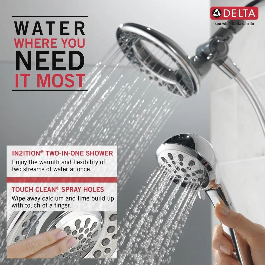 The In2ition® Two-in-One Shower gets water where you need it most using the integrated shower head and hand shower separately or together