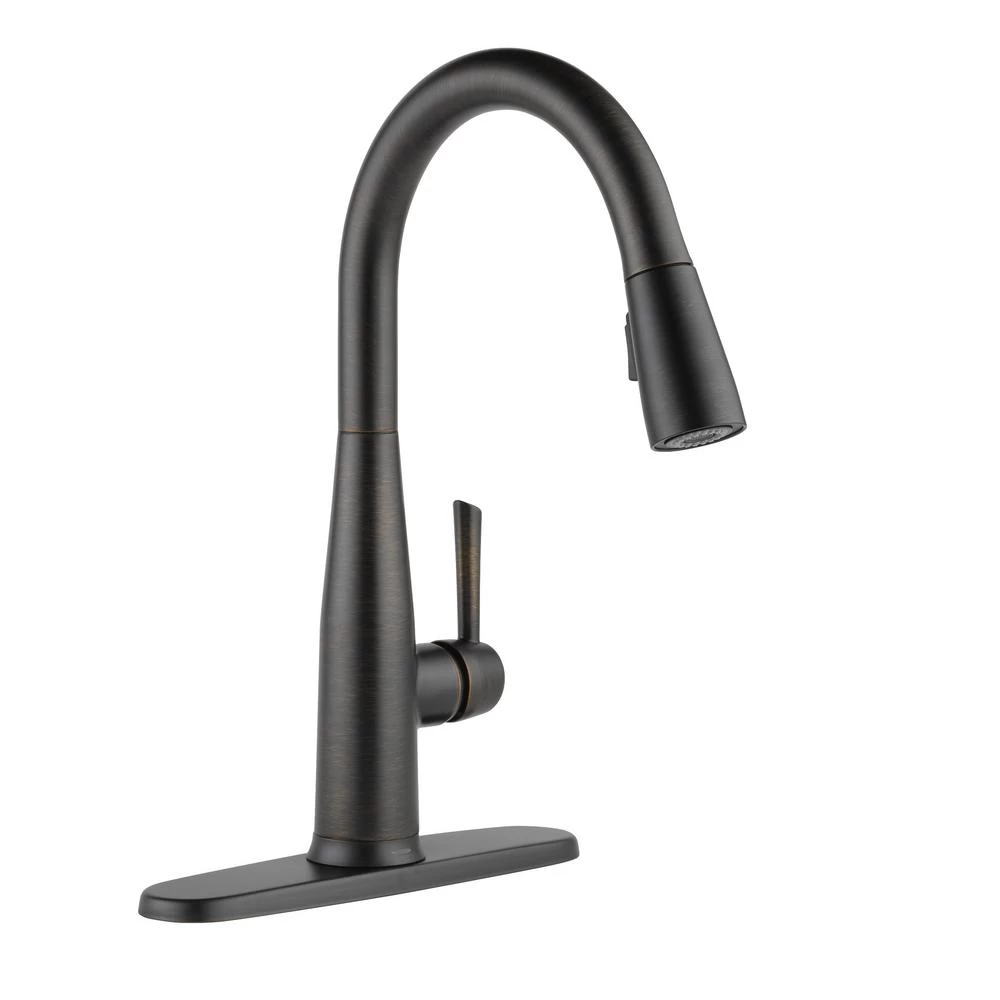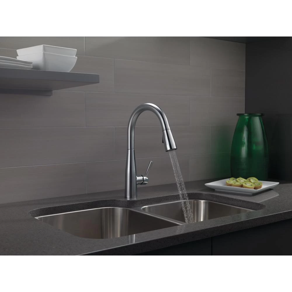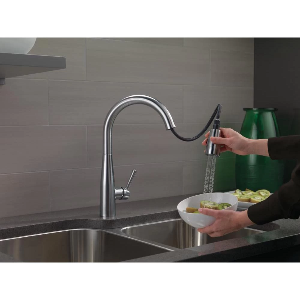 This Essa Single-Handle Pull-Down Sprayer Kitchen Faucet in Arctic Stainless with MagnaTite Docking. The pull-down spray wand comes free with a gentle tug and gives you total flexibility. The hose extends and retracts without friction points, fed by gravity. As you raise the wand to dock it, the magnet embedded in the spout pulls the wand precisely into place. So, unlike other pull-downs that tend to droop over time, MagnaTite keeps your pull-down faucet looking picture-perfect. Delta’s exclusive DIAMOND Seal Technology uses a valve with a tough diamond coating. InnoFlex PEX waterways keep water inside the faucet out of contact with potential metal contaminants. This powerful combination brings you a faucet built to last up to 5 million uses. Only Delta faucets are equipped with Touch-Clean soft, rubber nubbins that allow you to easily wipe away calcium and lime build-up with the touch of a finger.
