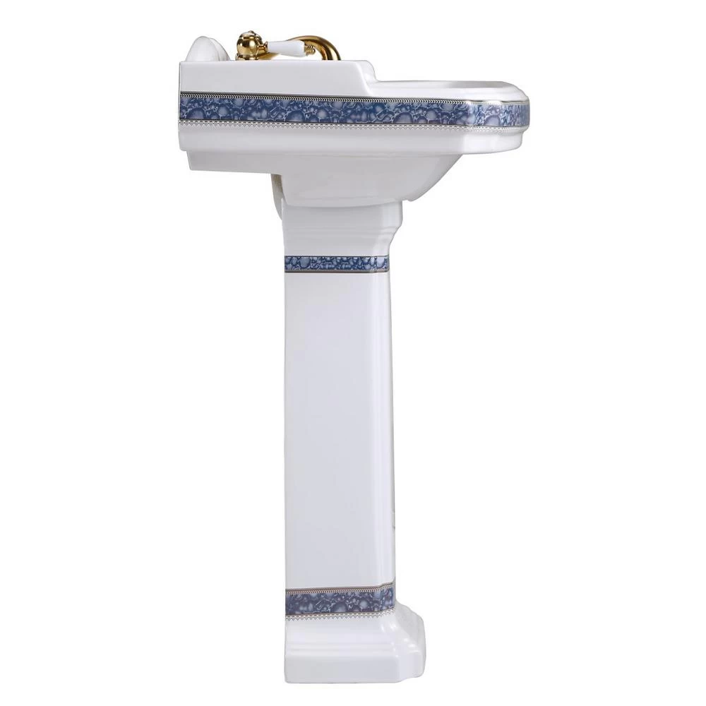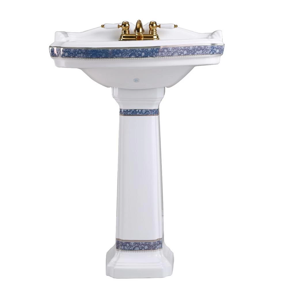 Bathroom Pedestal Sink Unique Blue and Gold Painted Design White Porcelain 4 in. Center set Faucet Holes. Faucet is not included. Interested in a matching toilet. Please see item 32816. Unprecedented Elegant Design in ECommerce. Renovator’s Supply Ornate India Reserve Pedestal Sink Material: Porcelain Glossy Porcelain Blue and Gold Accent Dimensions 22-7/8 in. Wide, 34-1/4 in. Height, 18-1/2 in. proj. Centerset Faucet Hole Boring with Overflow in Single Basin Matching Toilet Available in Catalog Search ”32816”.