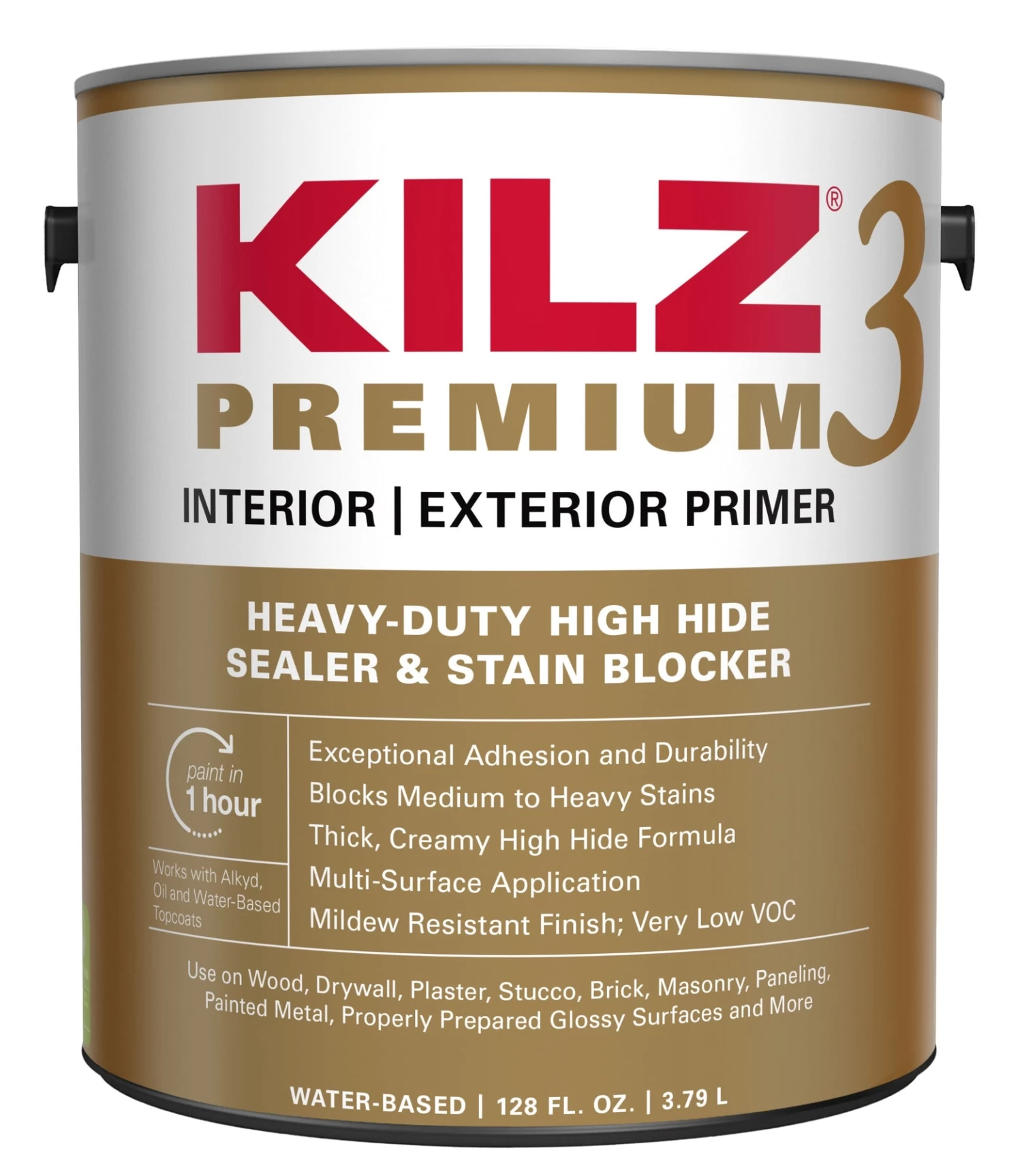 New Look, Same Trusted Formula. Achieve better results on your painting project by prepping your surface with KILZ 3 Premium Primer, Sealer & High-Hide Stainblocker. Formulated for excellent adhesion to most surfaces and featuring powerful stainblockers to prevent stains from leaching through the topcoat. KILZ Premium also features mildewcide protection to help prevent mildew and mold on your surface and just the right consistency to provide a smooth and level finish that seals porous surfaces and fills in small imperfections. Use on interior and exterior drywall, plaster, woodwork, paneling, masonry and brick. KILZ Premium’s mildew-resistant finish makes it ideal for high-humidity areas including bathrooms and laundry rooms. Very low VOC* formula, low odor and easy clean up with soap and water makes it safe to use in occupied homes and work spaces. Use for color changes, to seal light to medium stains before painting and to minimize surface imperfections caused by texture and porosity differences. Not recommended for heavy stains. *Formulated without addition of VOC containing solvent. <5 g/l=”” voc,=”” excluding=””>5>