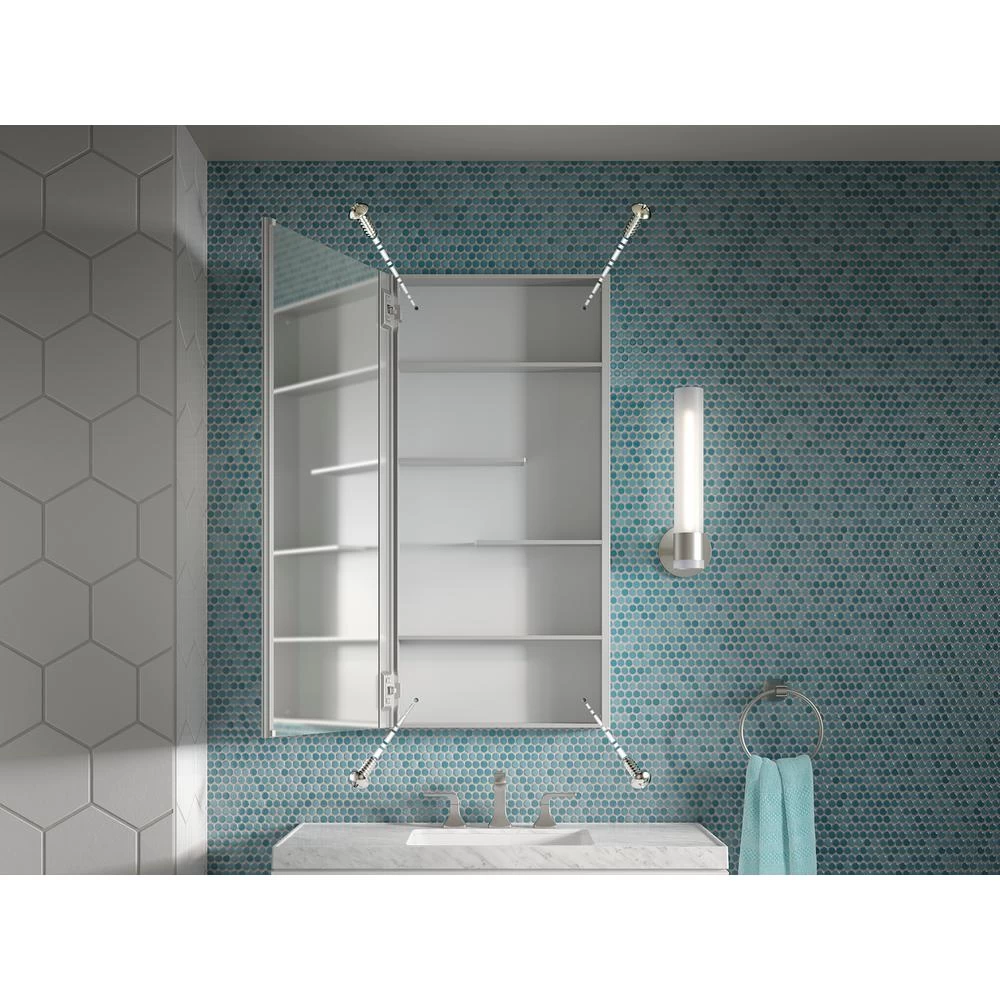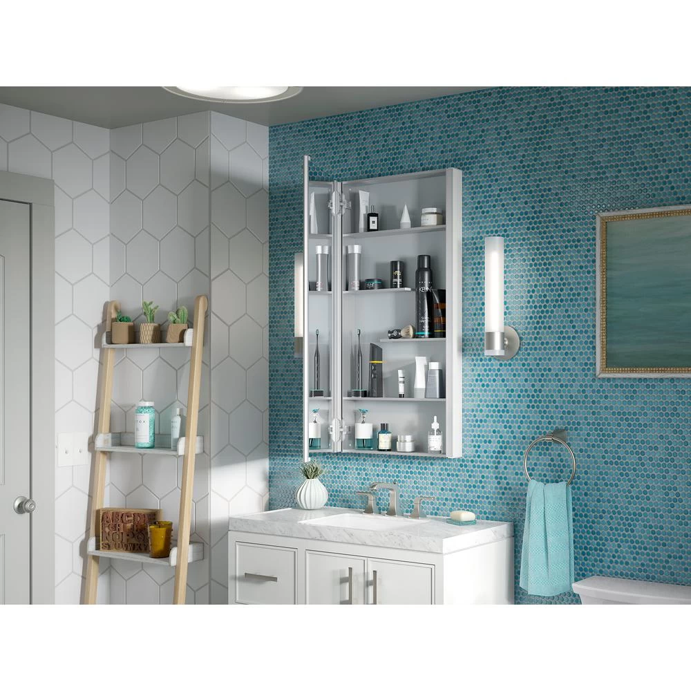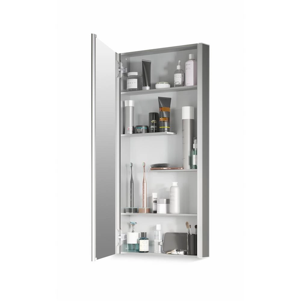 Maximize your bathroom storage with the Maxstow medicine cabinet. Staggered shelving holds tall and short items with no wasted space, fitting everything you need and keeping clutter off your countertop. The slim 3-1/2 in. -deep design provides the same internal storage space as traditional 5 in. -deep cabinets. Installation is fast and easy simply screw to the wall, right out of the box.
