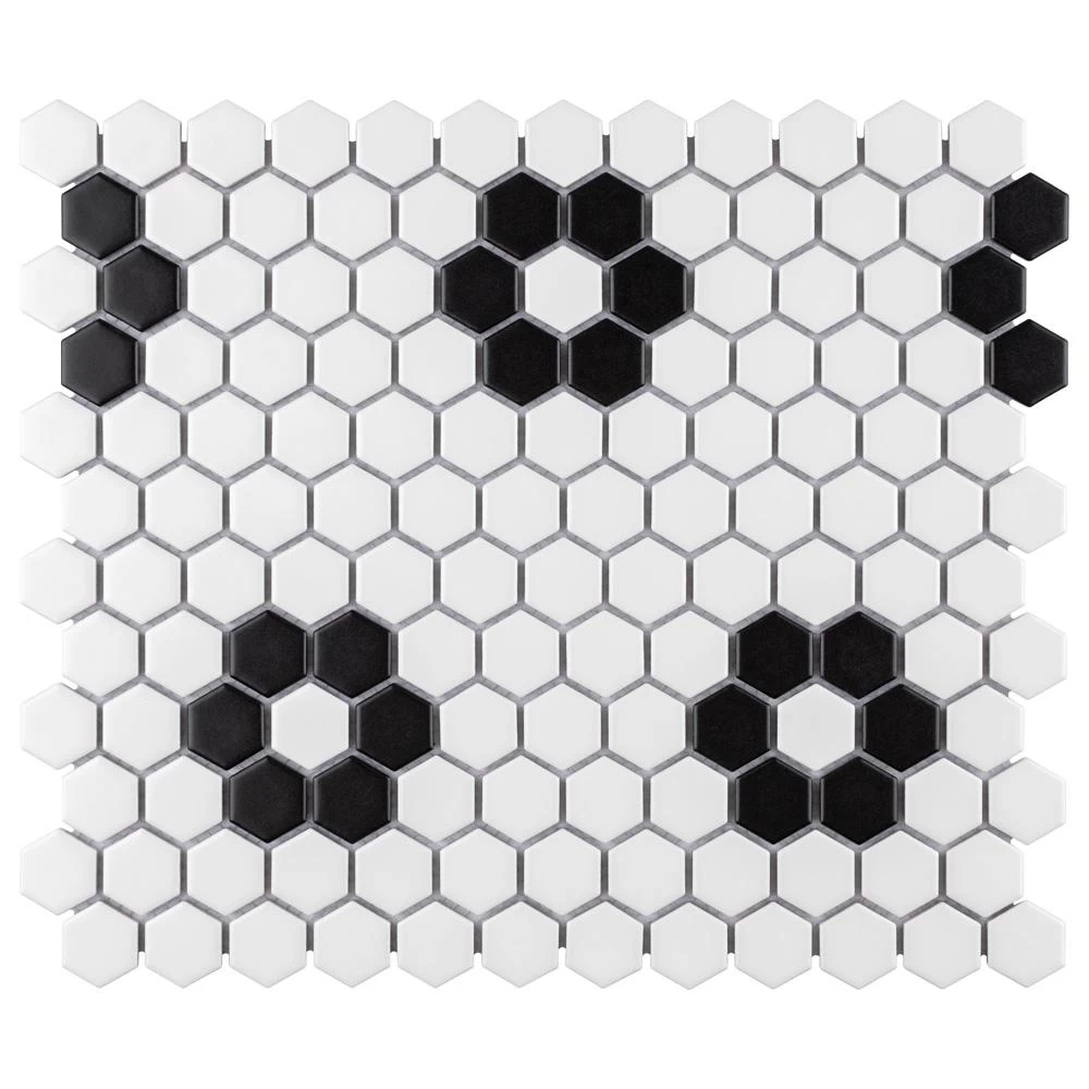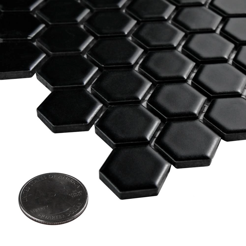 Transform your home into a tribute to retro design with the Merola Tile Metro Hex Matte Black 10-1/4 in. x 11-3/4 in. x 5 mm Porcelain Mosaic Tile. This time-tested classic 0.88 in. hexagon chip mosaic is a throwback to traditional retro design. Matte black hexagons are precisely arranged on an interlocking mesh to create a seamless installation. This minimalist porcelain mosaic is frost-resistant and ADA-compliant, making this an excellent choice for a modern installation or historic renovation. If pairing with other products in our Metro Hex series, please consider that all formats and thicknesses may not be the same.