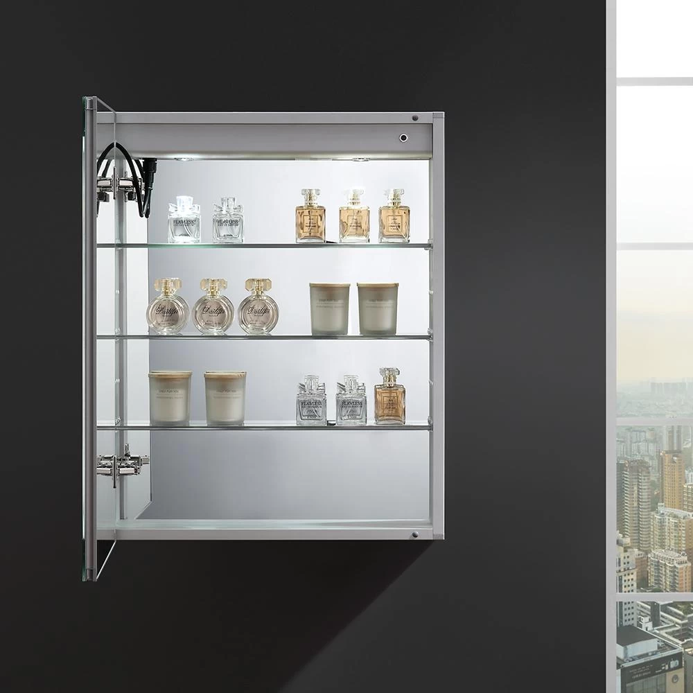 The Fresca Bathroom Medicine Cabinet comes with everything you need to create an elegant and modern bathroom, with every convenience right in front of you. On the outside, its a sophisticated mirrored medicine cabinet with a built-in dimmable surface LED task light which creates an illuminated frame within the mirror. It also has a defogger feature. Inside, there’s an LED light and a handy electrical/USB outlet combo for an electric shaver, toothbrush or other essentials. The interior features 3 adjustable glass shelves and a mirrored back wall. The double-sided mirrored door swings right on 170°, soft-close BLUM hinges. Measuring 24 in. W x 30 in. H x 5 in. D, this medicine cabinet is available in several sizes.