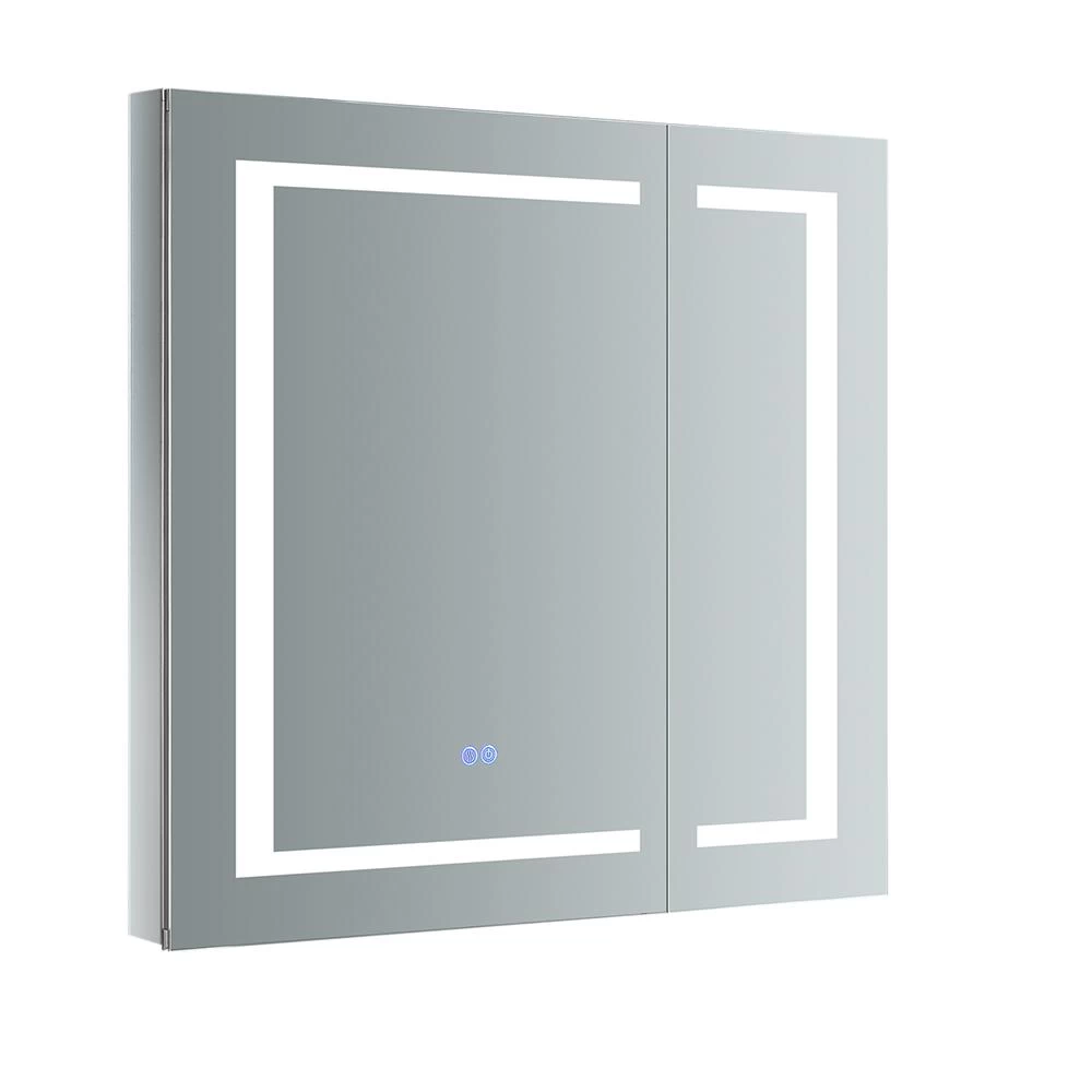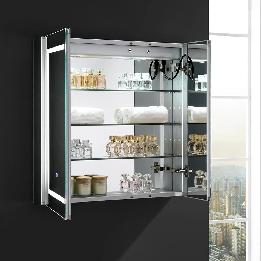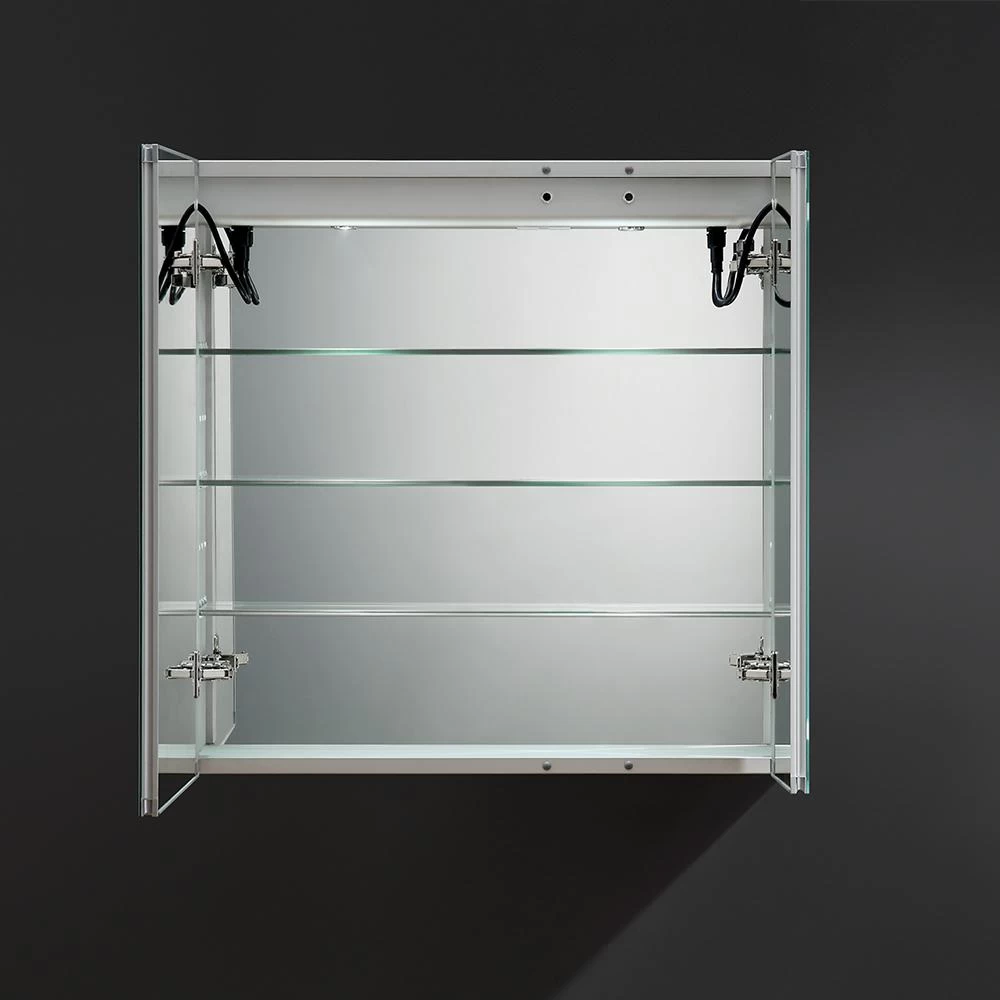 The Fresca Bathroom Medicine Cabinet comes with everything you need to create an elegant and modern bathroom, with every convenience right in front of you. On the outside, its a sophisticated mirrored medicine cabinet with a built-in dimmable surface LED task light which creates an illuminated frame within the mirror. It also has a defogger feature. Inside, there’s an LED light and a handy electrical/USB outlet combo for an electric shaver, toothbrush or other essentials. The interior features 3 adjustable glass shelves and a mirrored back wall. The double-sided mirrored doors swing 170°s on soft-close BLUM hinges. Measuring 30 in. W x 30 in. H x 5 in. D, this medicine cabinet is available in several sizes.