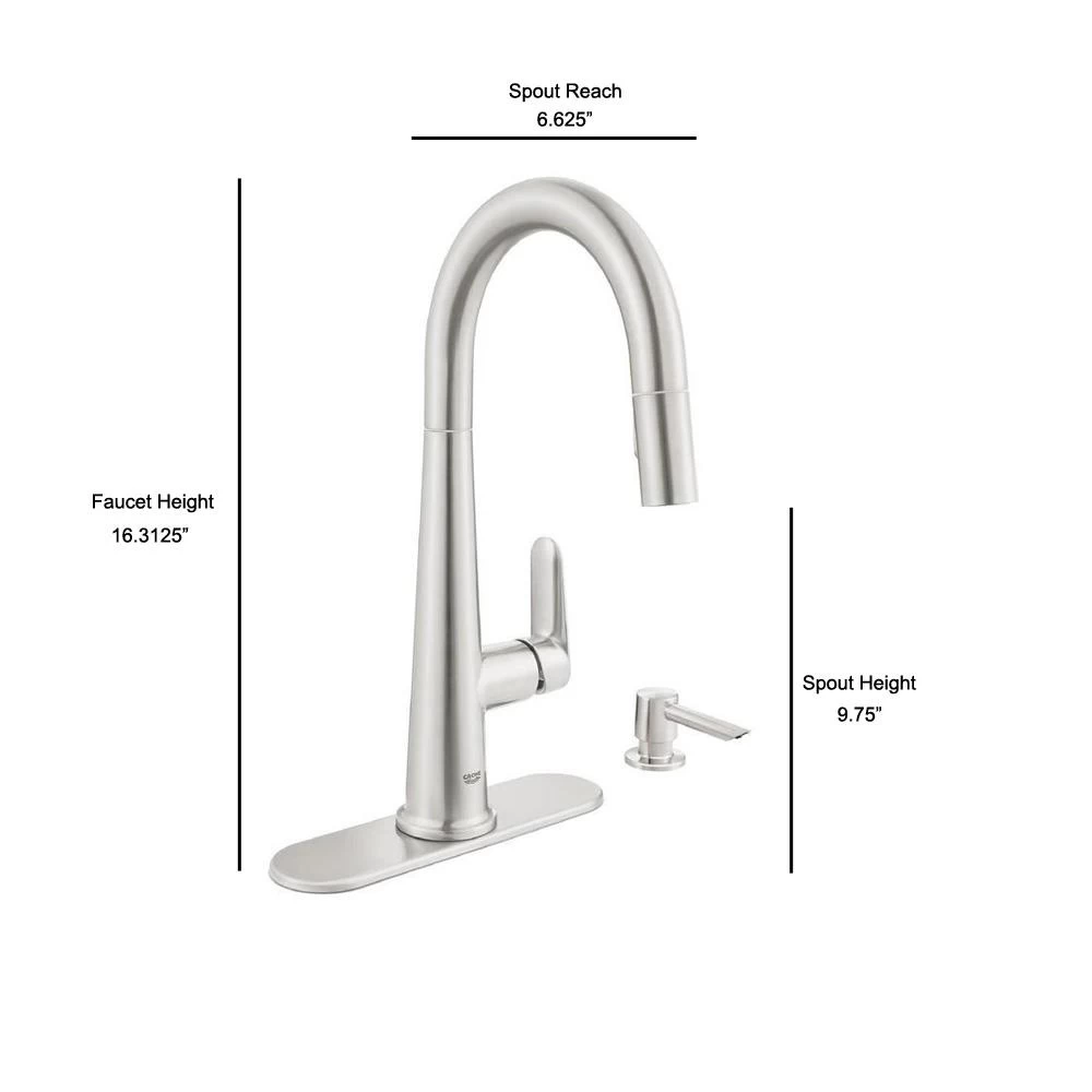 Sleek, elegant and unabashedly minimalist, the GROHE Veletto pull-down faucet with soap dispenser in Chrome cuts a dramatic figure in any modern or transitional-style kitchen. As functional as it is visually striking, the faucet offers smooth, precise control of the water temperature and volume, thanks to a side lever handle equipped with a GROHE SilkMove cartridge, and a gooseneck swivel spout with 360° rotation. The spout incorporates a pull-down spray head featuring 2-spray functions stream and spray and GROHE SpeedClean nozzles that resist lime scale buildup. The GROHE StarLight Chrome finish will neither tarnish nor scratch, retaining its brilliance through a lifetime of use.