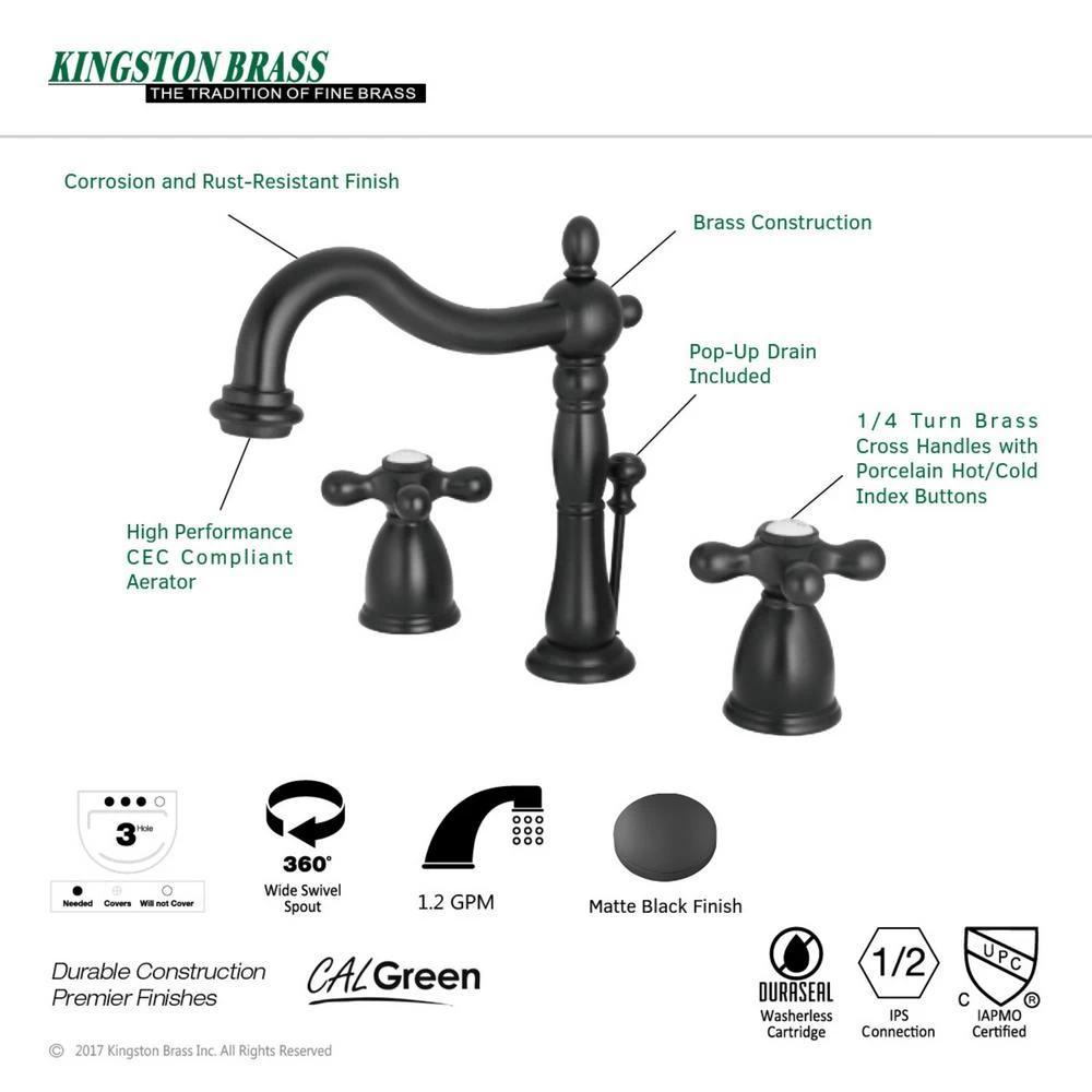 With a Victorian high curved spout, the widespread faucet is suitable for transitional bathroom decor settings. This faucet is constructed from solid brass for durability and reliability and utilizes washerless valve for drip-free performance. A brass pop-up drain is included.
